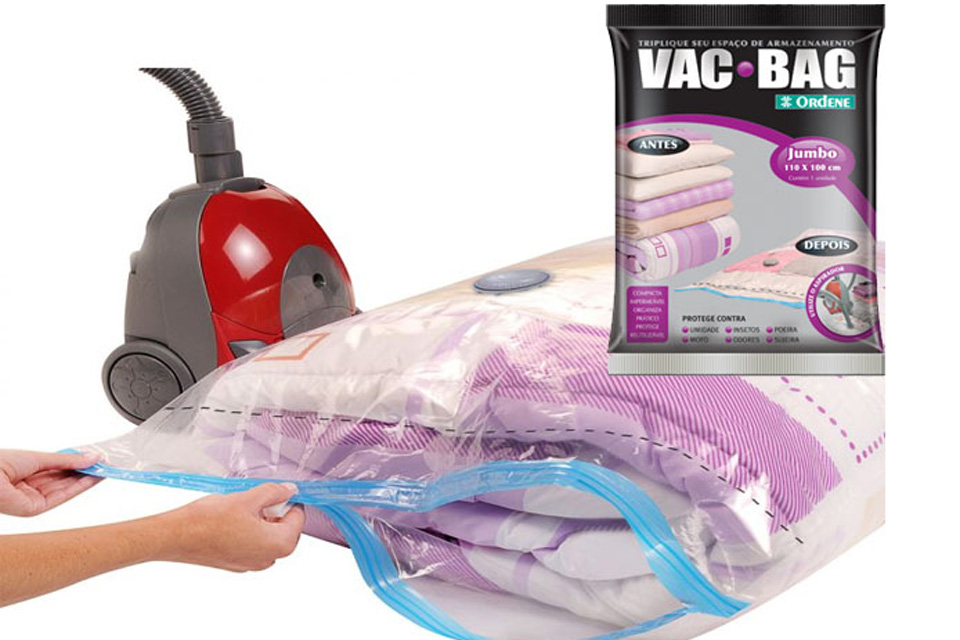 Trata-se de um plástico resistente, com um lacre parecido com o do Zip Lock e uma trava, onde coloca-se o cano do aspirador de pó para tirar todo o ar de dentro do plástico e diminuir substancialmente o volume. Acomodei cuidadosamente as roupas num Vac Bag (quanto mais organizado, mais itens conseguirá acomodar), lacrei e com o aspirador de pó instalado na válvula do plástico tirei todo o ar possível. Desta forma, consegui acomodar em meu maleiro todas as peças que só voltarei a utilizar na próxima estação e consegui mais espaço no guarda-roupa.